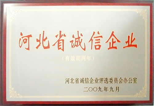 2009年9月,我公司被河北省誠信企業(yè)評選委員會(huì )評為“河北省誠信企業(yè)”,并被收入《河北誠信企業(yè)建設成果集》。證書(shū)及獎牌于近日發(fā)放到公司。