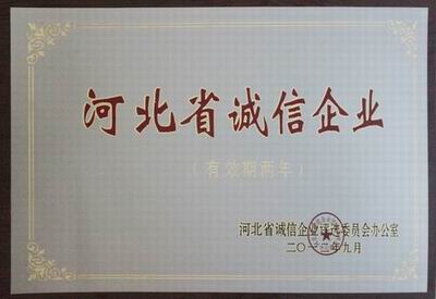 2012年9月26日上午,在河北省石家莊市召開(kāi)了2012年“河北省企業(yè)誠信建設經(jīng)驗交流會(huì )”暨“河北省誠信企業(yè)”授牌儀式。我公司被評為2012年“河北省誠信企業(yè)”,公司董事長(cháng)、總經(jīng)理王振剛被評為“河北省企業(yè)誠信建設優(yōu)秀工作者”。河北省整頓和規范市場(chǎng)經(jīng)濟秩序領(lǐng)導小組辦公室、河北省誠信企業(yè)評選委員辦公室、河北省企業(yè)家協(xié)會(huì )聯(lián)合對獲獎企業(yè)予以表彰,并頒發(fā)了證書(shū)。誠信是企業(yè)生存的根本,誠信是企業(yè)發(fā)展的法寶。