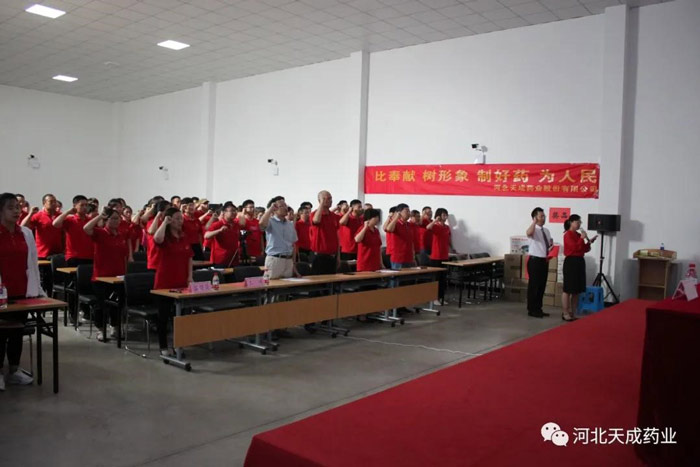 滄州經(jīng)濟技術(shù)開(kāi)發(fā)區企業(yè)黨委負責人曲明利發(fā)表講話(huà),他稱(chēng)贊天成藥業(yè)黨總支部近年來(lái)組織建設成果顯著(zhù),黨員精神風(fēng)貌良好,鼓勵我們再接再厲。